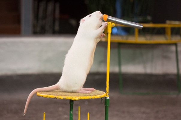 Крысы прыгают через кольца, преодолевают барьеры и катаются на мини-машинке.